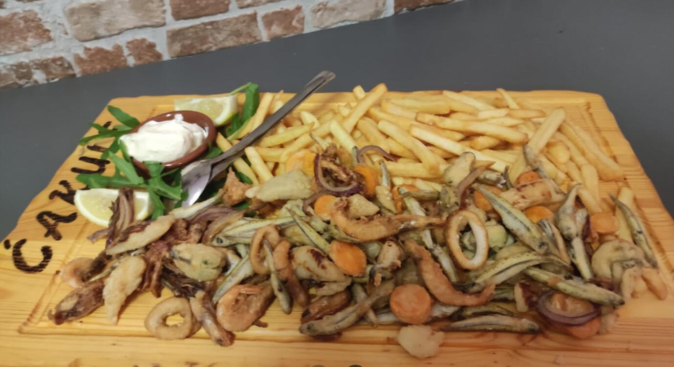 Dalmatinische Frirura Čakule für zwei Personen mit Beilage (Tintenfisch, Garnelen, Gaun, Muscheln, Seehecht, Kapula, Karotten) – 37,00 €STEAK