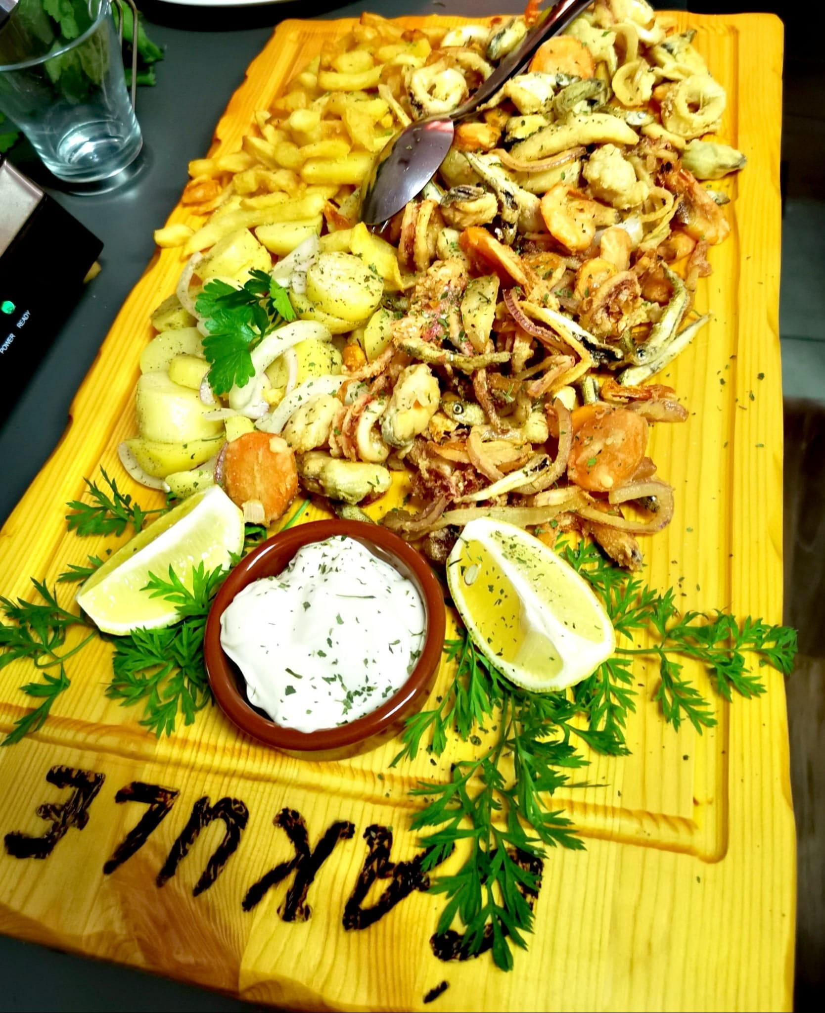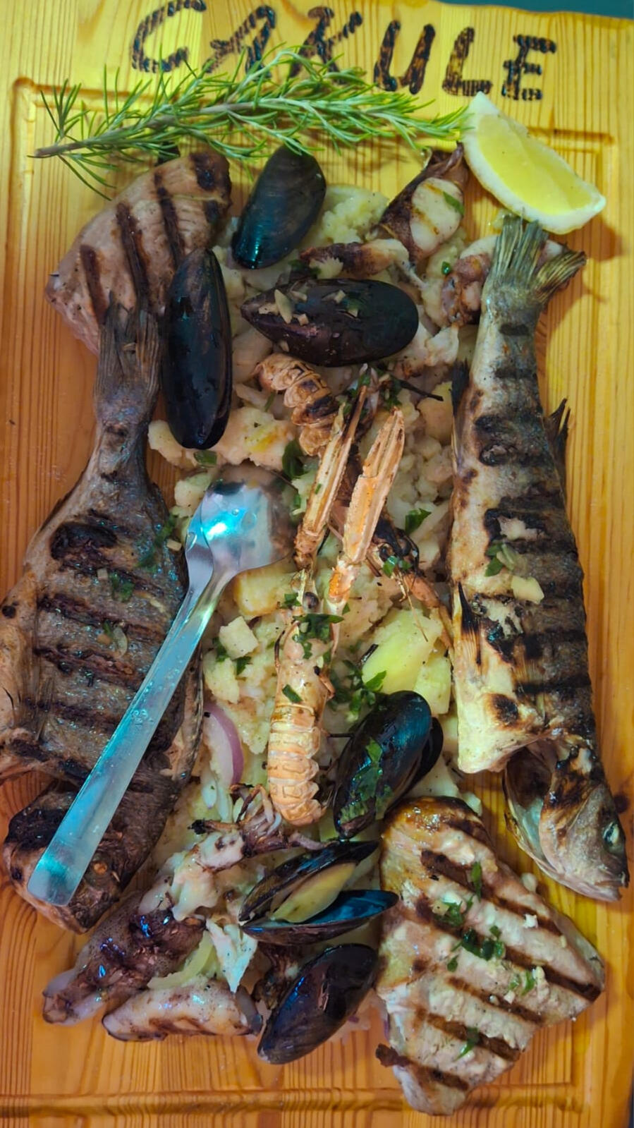 Fischplatte für zwei Personen mit Beilage (Wolfsbarsch, Dorade, Garnelen, Tintenfisch, Thunfisch, Muscheln) – 58,00 €FISCHSPEZIALITÄTEN DES HAUSES